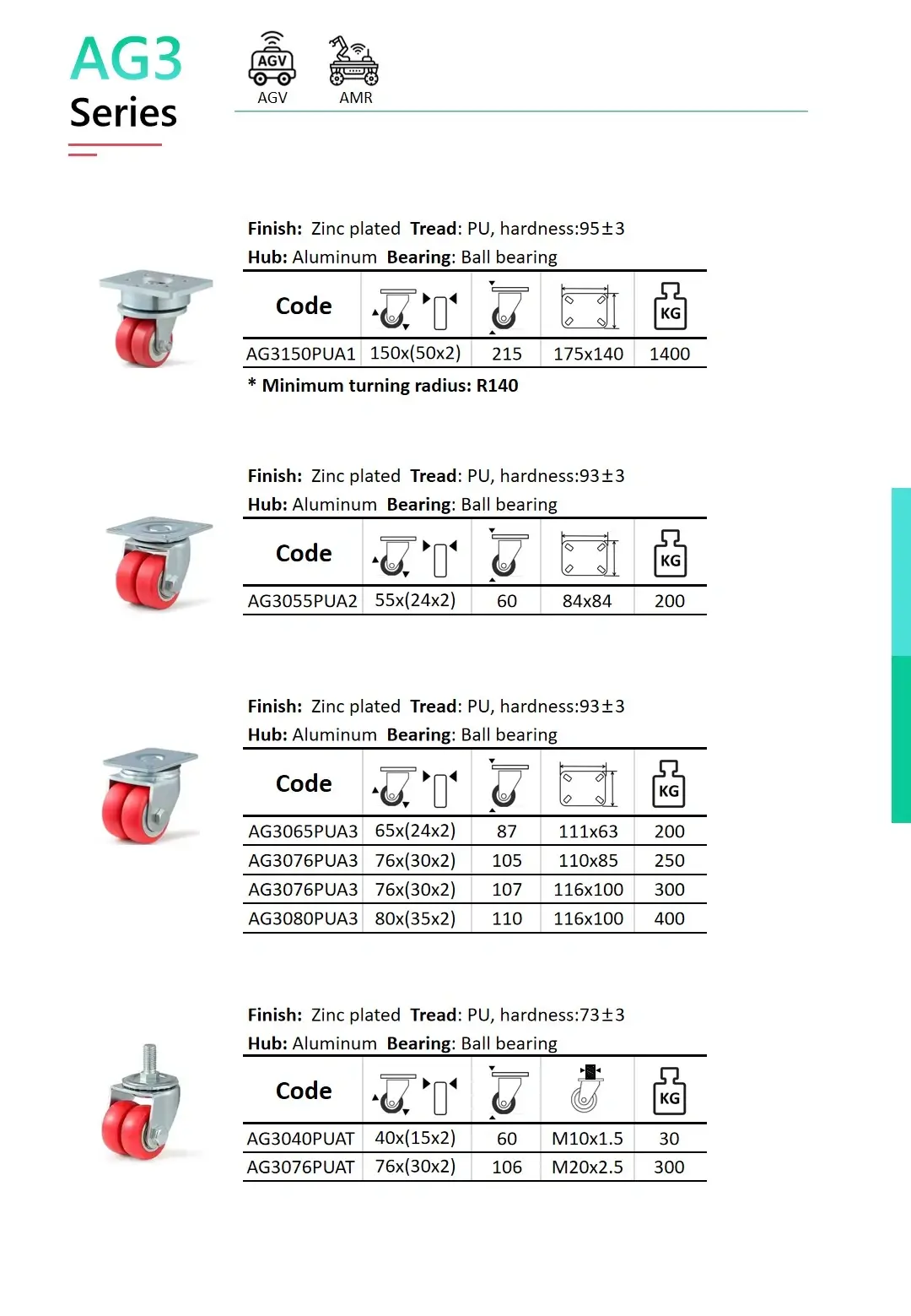 • Polyurethane (PU) AGV wheels: Non-marking, durable, low rolling resistance